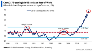 There was large dispersion across asset classes this year with few patterns across markets. Gold led all major asset classes, up 27% (silver up 22%) as we had projected in last year’s letter. The two key themes of the markets for 2024 are the rise of AI (which everyone is talking about) and the rise of gold (which nobody is). From an equity perspective, US markets led in somewhat of a frantic move (above every analyst projection on the street by a wide margin) but did so in a narrow fashion by the large cap tech names, leaving broader stocks, especially small cap and value behind. Historical extremes have become more so. International developed stocks were basically flat for the year, emerging market stocks were up slightly in aggregate, and bonds were negative (again) for the year, impacting typical 60/40 stock bond portfolios. As I write this, the markets have fallen for the last four days of the year—something that hasn’t happened since 1966, given what is typically a strong seasonal period. As a fun fact, the market following that year entered a 16-year bear phase.