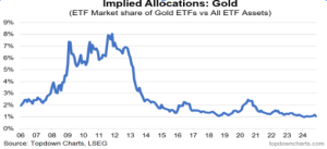 - The chart below shows that even after this major move in gold, western investors could care less given essentially no relative flows into gold ETF. This data point seems to indicate that there may be much more to run as flows have not started yet.